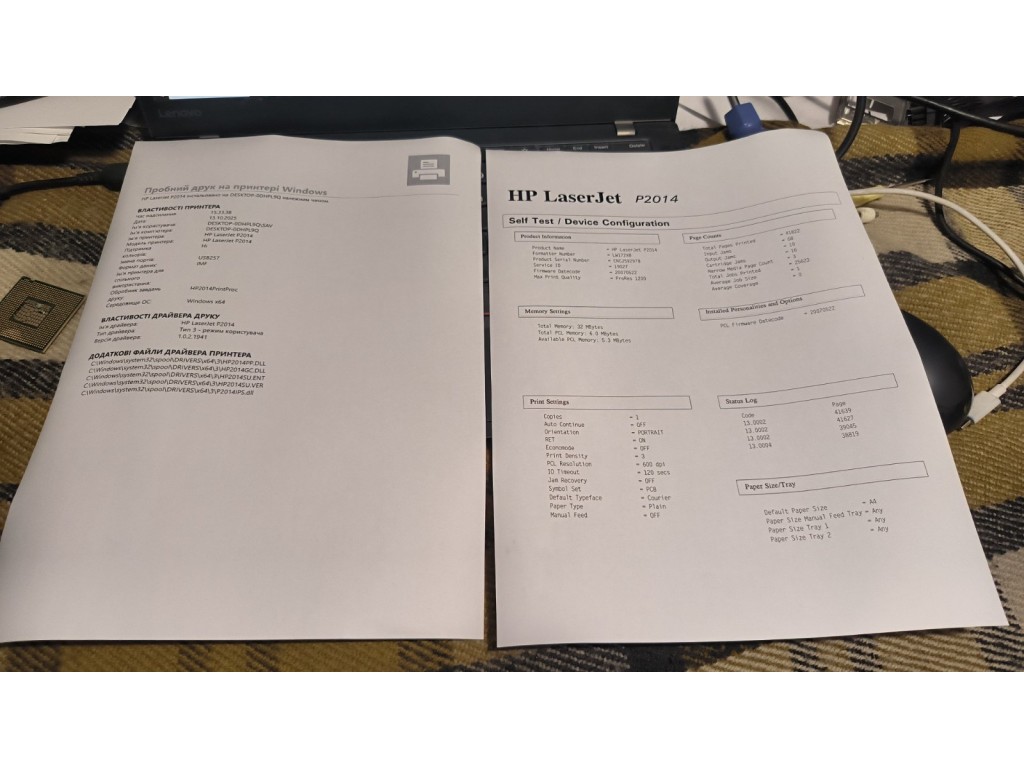 Картридж у комплекті, приклад друку сервісної сторінки на фото.