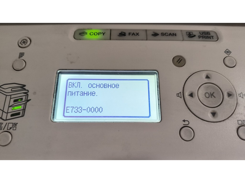 Помилка термовузла, термоплівка пошкоджена, половини нема. Без картриджу. Відсутні петлі сканерного столу. Компьютером бачиться.