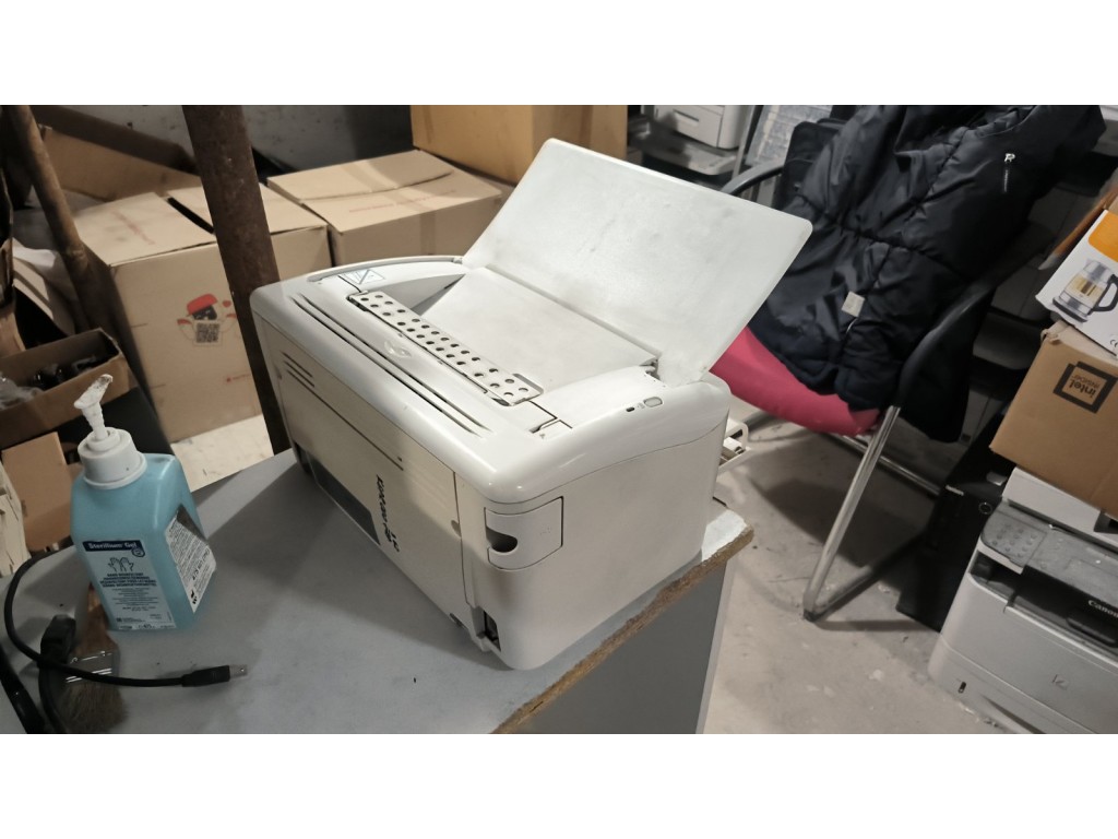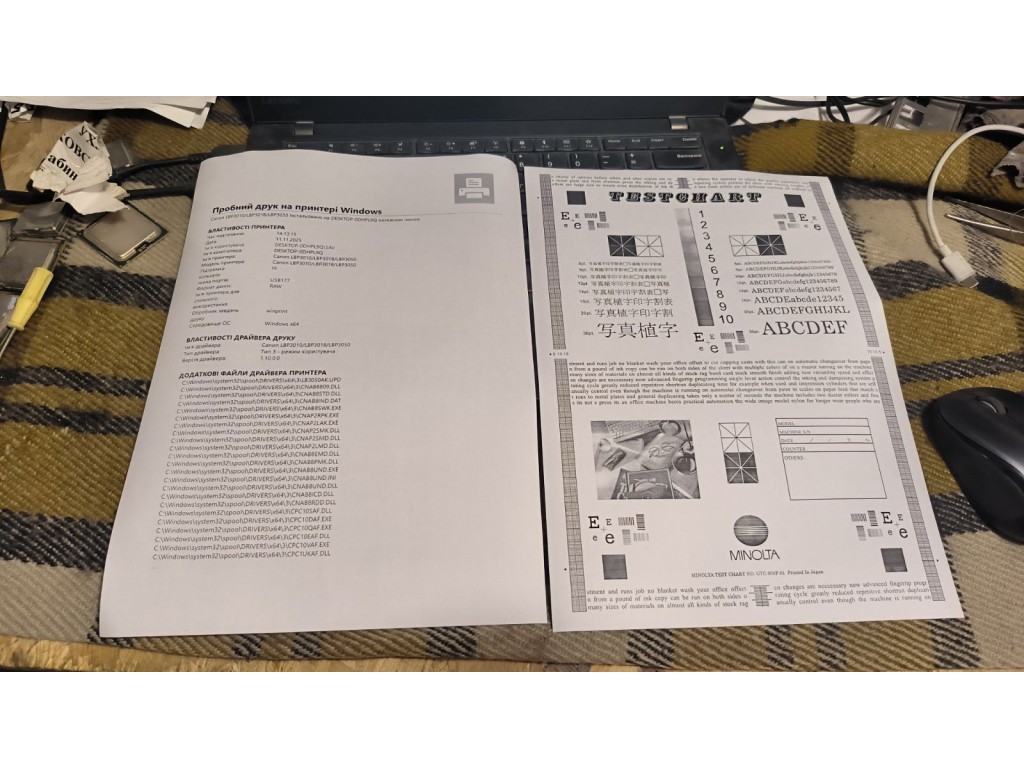 Друкує. Чистий друк. Картридж у комплекті. Приклад друку на фото. Картридж кілько разів вже заправлявся, тому трошки шумний. Комплект кабелів +100гр.