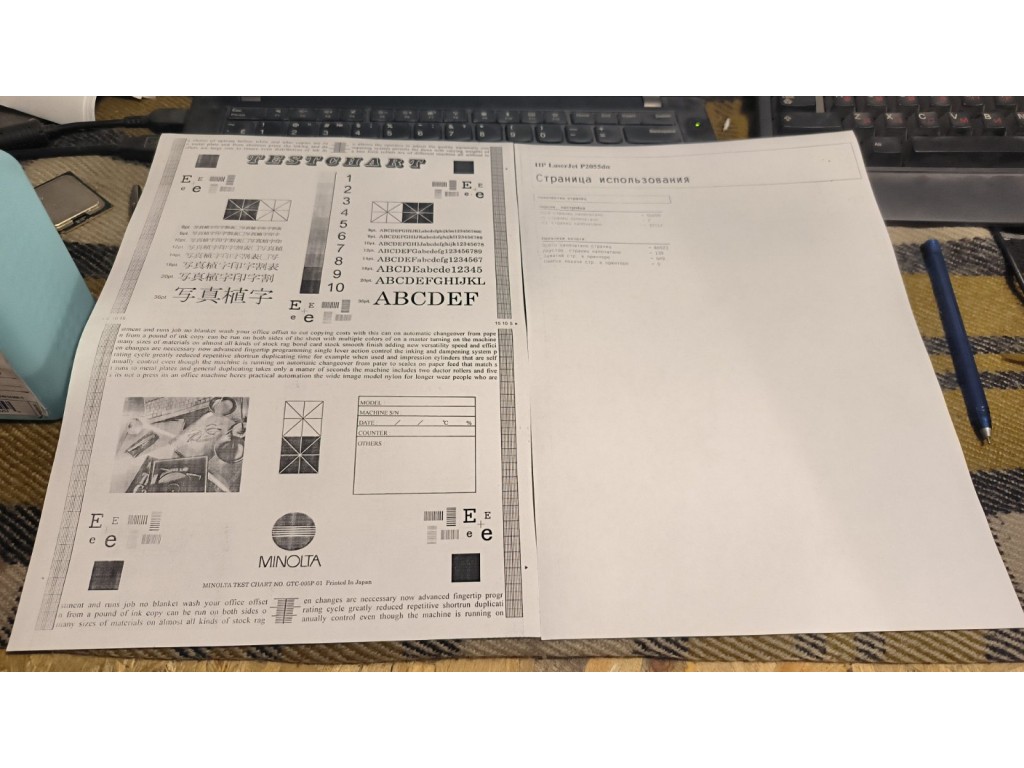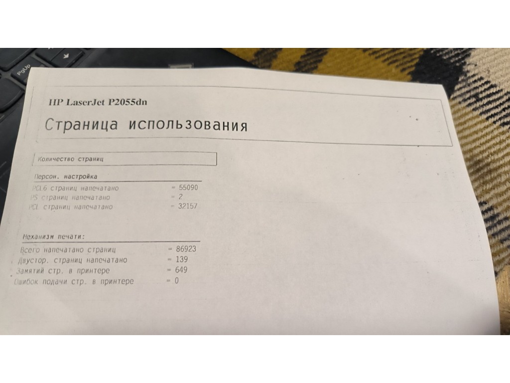Друкує, дуплекс, LAN. Стан на фото. Уставша по краям термоплівка, але поки ціла. Картридж у комплекті, приклад друку сервісної сторінки з пробігом на фото. Комплект кабелів +100гр.