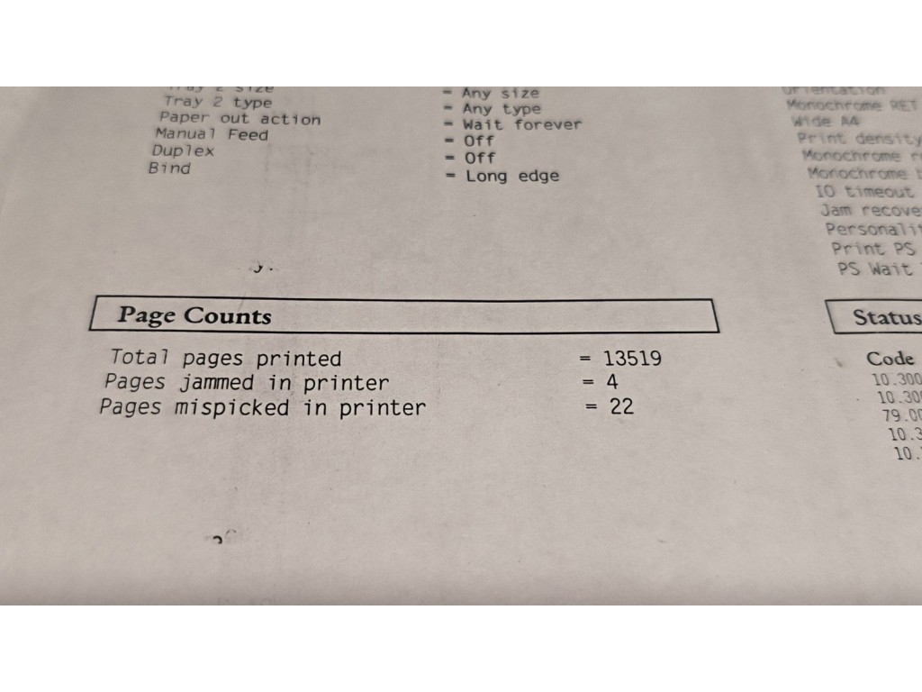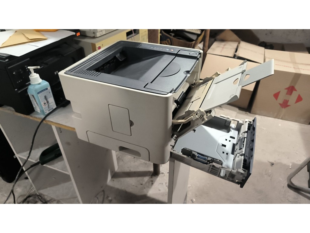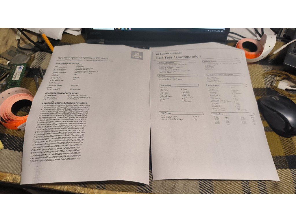 Друкує, дуплекс. Малий пробіг, картридж у комплекті. Приклад друку сервісної сторінки на фото. Картридж маже, з добрим картриджем буде чистий друк, термоплівка в ідеалі. Комплект кабелів (мережевий+USB) +100гр.