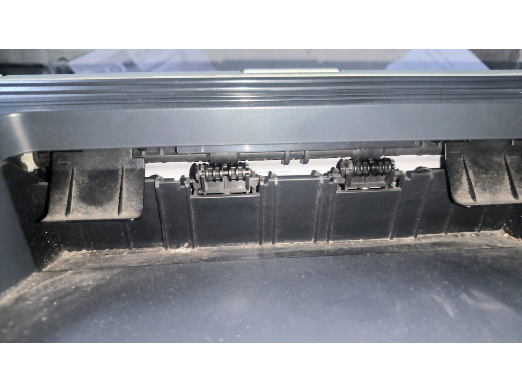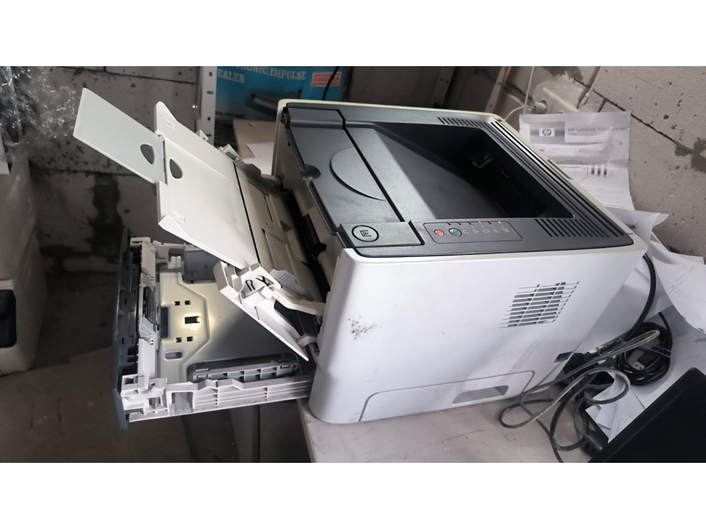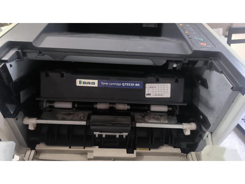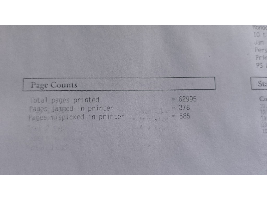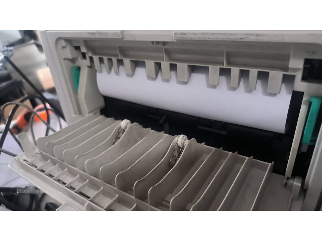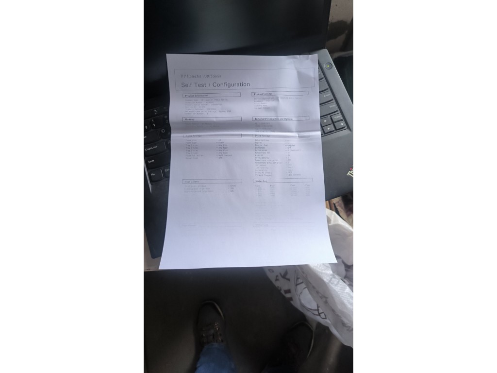 Зупиняється папір перед валом виходу. Форматер проїшов добову перевірку. У комплекті проблемний картридж збільшеного об'єму, дає горизонтальні полоси. На фото приклад друку сервісної сторінки з іншим картриджем. Комплект кабелів +100гр